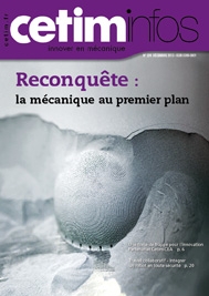« Reconquête : la mécanique au premier plan. » : telle est la thématique principale du dernier Cetim Infos de décembre 2013. Le dossier rappelle le vaste ensemble de mesures annoncé par le gouvernement ces derniers mois pour favoriser l’innovation en France. Il démontre aussi que cette relance par l’innovation souhaitée et voulue par les politiques correspond déjà au Leitmotiv des mécaniciens. Présente dans tous les domaines clés et les filières d’avenir, la mécanique a, en effet, depuis longtemps, mis ses savoir-faire au service de cette ambition : faire gagner les entreprises tous secteurs confondus. Au-delà des travaux déjà accomplis dans ce domaine de l’innovation, les entreprises mécaniciennes ont un rôle de premier plan à tenir dans ce vaste programme évoqué par l’État.